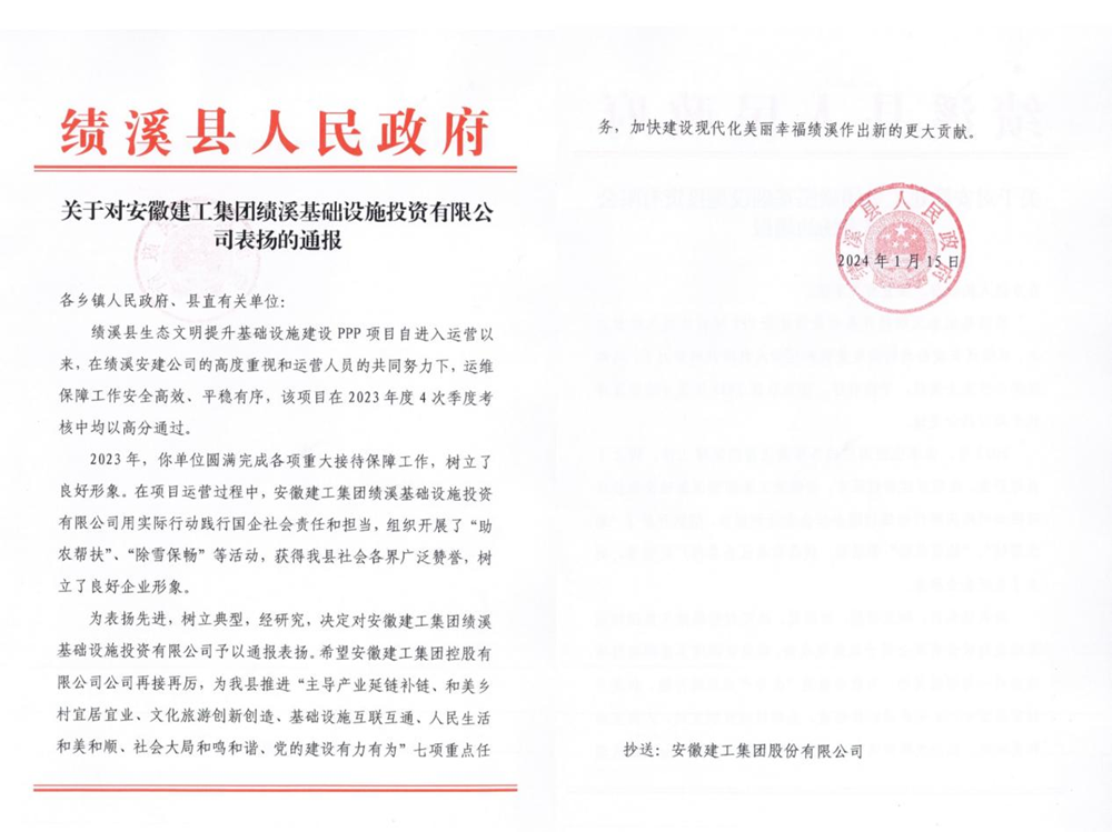 1月15日,建工投資績溪項目公司喜獲績溪縣人民政府通報表揚,充分肯定了項目公司2023年運營管理工作取得的優(yōu)異成績。