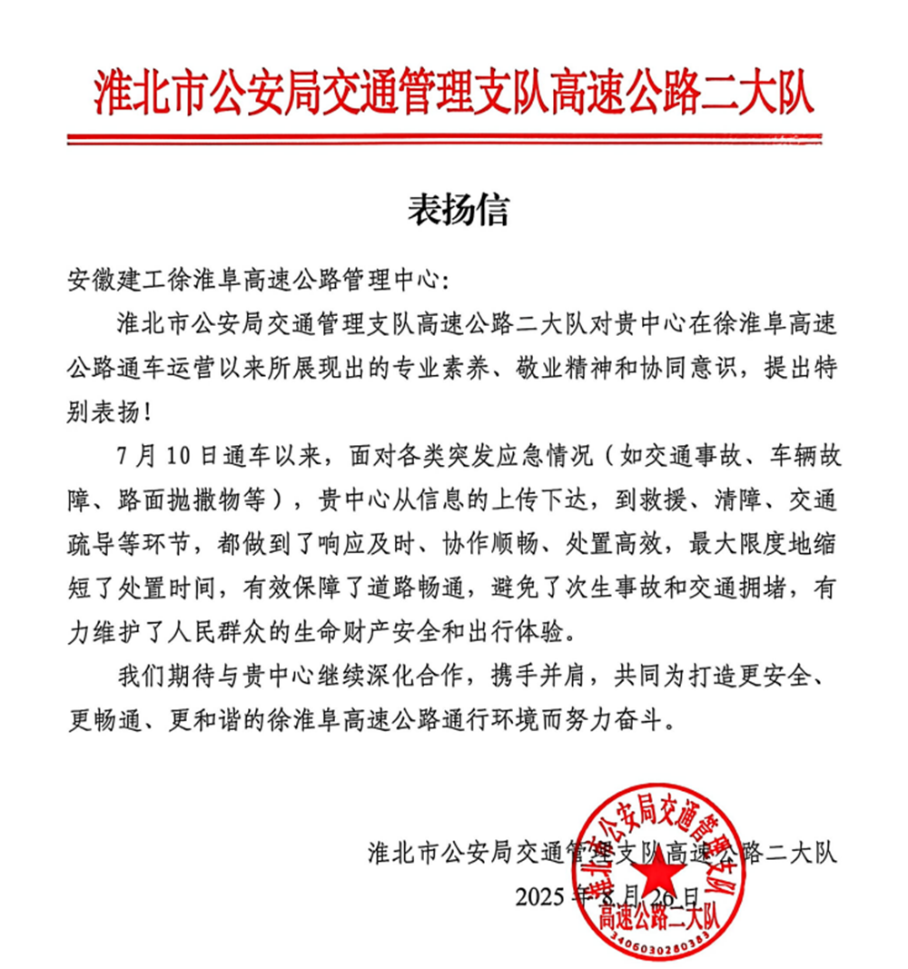8月26日,安徽建工徐淮阜高速公路管理中心收到淮北市公安局交通管理支隊(duì)高速公路二大隊(duì)表揚(yáng)信,對(duì)管理中心在徐淮阜高速通車運(yùn)營以來展現(xiàn)的專業(yè)素養(yǎng)、敬業(yè)精神與協(xié)同意識(shí)提出特別表揚(yáng),同時(shí)對(duì)雙方在應(yīng)急處置工作中形成的高效協(xié)作機(jī)制給予高度肯定。